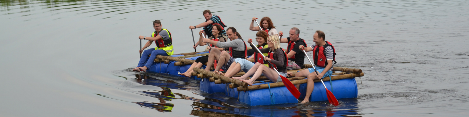 Wij werken met grote 200-liter vaten, palen, touwen en spanbandjes. Met deze materialen kun je een uiterst stevig vlot bouwen. Per mail krijg je van ons een instructieformulier toegestuurd die je zelf kunt uitprinten. Ook is ons instructieformulier online in te zien via: hier. Je kunt er natuurlijk ook voor kiezen om de deelnemers zelf een goede constructie te laten bouwen.